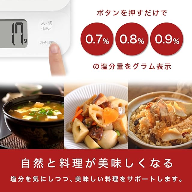 【料理の味付けに】食材の全体量に対してちょうどいい塩分量の目安がわかる!濃度は0.7、0.8、0.9%を設定できます。料理ごとに美味しい味付けが簡単にわかるから、自然と料理が上手になります。
