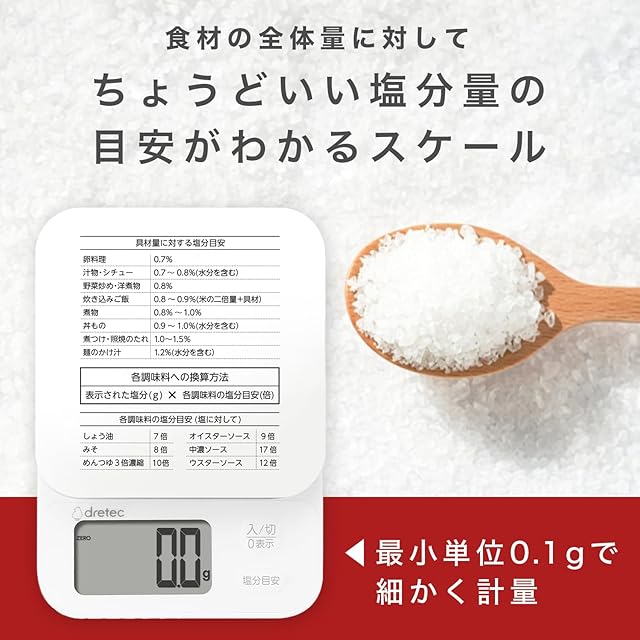 ドリテック(dretec) 味付けの目安がわかるスケール 塩分濃度計 塩分計 メソッド付き シリコーンカバー付き デジタルスケール 3kgまではかれる デジタル 大画面 簡単 0.1%単位 減塩 ホワイト