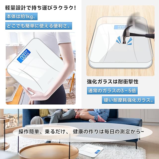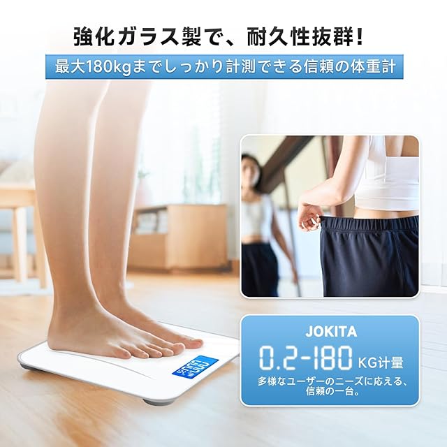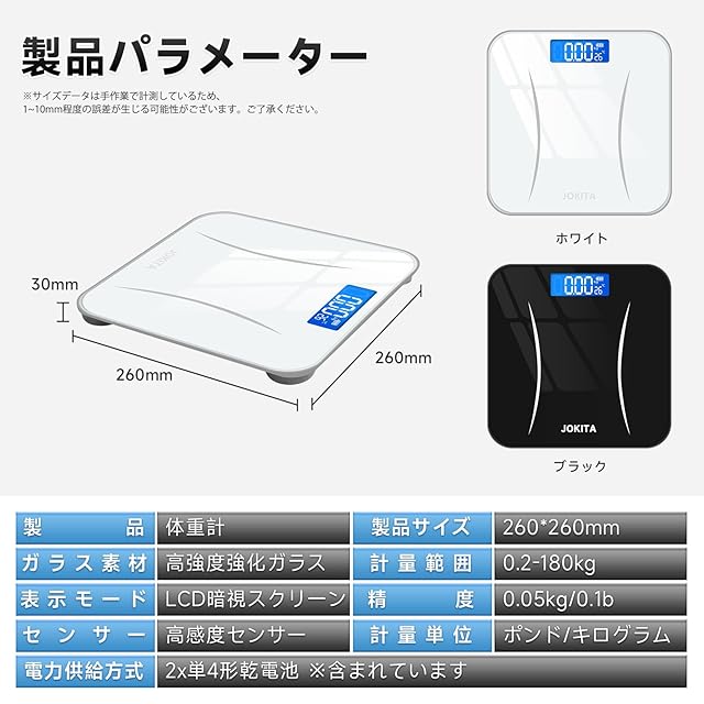 【パッケージ内容】体重計本体*1 + 日本語取扱説明書*1 + 単4形乾電池*2が含まれています。この製品は2本の単4形乾電池で動作しますので、注意が必要です。製品の背面にある黒いボタンは重量単位を設定するためのものであり、KGやlb、lb stで表示され、LCD画面の背面の黒いボタンで調整できます。 【高精度】4つの高精度センサーを搭載しており、革新的な技術を使用して体重を正確に測定します。0.05kg/0.1lbの増分で高精度をしています。ただし、硬い表面で使用する必要があります。 【2本の単4形電池で使用/使いやすい】体重計に乗ると自動的に電源が入りますが、使用しない場合は15秒後に自動的に電源が切れるようになっています。エネルギーを節約するためです。 【滑り止めデザイン-単位切り替え】本体は強化ガラス製で、最大180kgまで耐えることができます。厚さは30mmで、狭いスペースに収納することができます。本体の重さは約1kgで、持ち運びが便利です。四隅にゴムバンドが付いておりズレにくいのもポイントで、床を傷つける心配はありません。単位切り替え:この体重計は、kg、LB、ST:LBの3つの単位で使用できます。 【包装内容と期間】パッケージ内容:体重計、2本の単4形電池、日本語のユーザーマニュアル。初期不良に対しては、購入後180日以内に返金または交換を提供します。製品に問題がある場合や、製品自体に問題がある場合(初期不良など)、すぐにお問い合わせください。連絡先の取り方については、以下の手順に従ってください:「アカウントサービス」→「注文履歴」→「販売者に連絡する」"