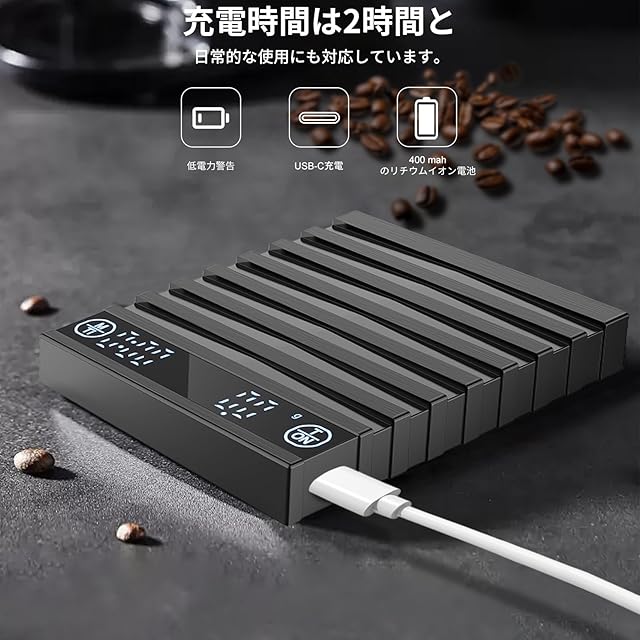 【USB充電&校正済み】 USB充電式スケールはtype-c充電口を採用しており、約2時間で充電が完了し、低充電時にはアラームが表示されます。コーヒーメーターにはキャリブレーション機能が搭載されています。精度が足りないと感じたらキャリブレーションができます。電源ボタンを4秒長押しすると、画面にcalが表示され、キャリブレーションモードに入り、重さを設定し、対応する重さ分銅を置くことができます。