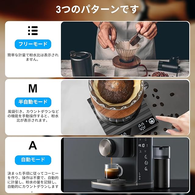 【3つのモード】コーヒースケールは、3つの異なるモードを搭載。1つ目は通常の計量で、粉水比は表示されません。2つ目は半自動モードで、このモードに切り替えると水の粉の割合が表示されるので、自分で風袋引き機能を使ってコーヒー粉の重さを測ります。水を注ぐ前に自分でタイマーに切り替え、水を注ぎ終えると自動的にタイマーが止まります。3つ目は全自動モードです。決まった手順で作業を進めていけばいいのです。