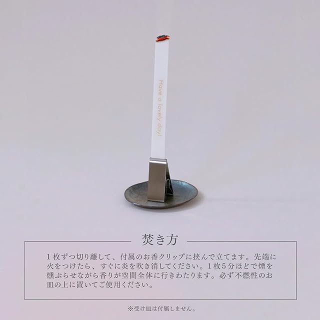 【焚き方】1枚ずつ切り離して、付属のお香クリップに挟んで立てます。先端に火をつけたら、すぐに炎を吹き消してください。1枚5分ほどで煙を燻ぶらせながら香りが空間全体に行きわたります。必ず不燃性のお皿の上に置いてご使用ください。