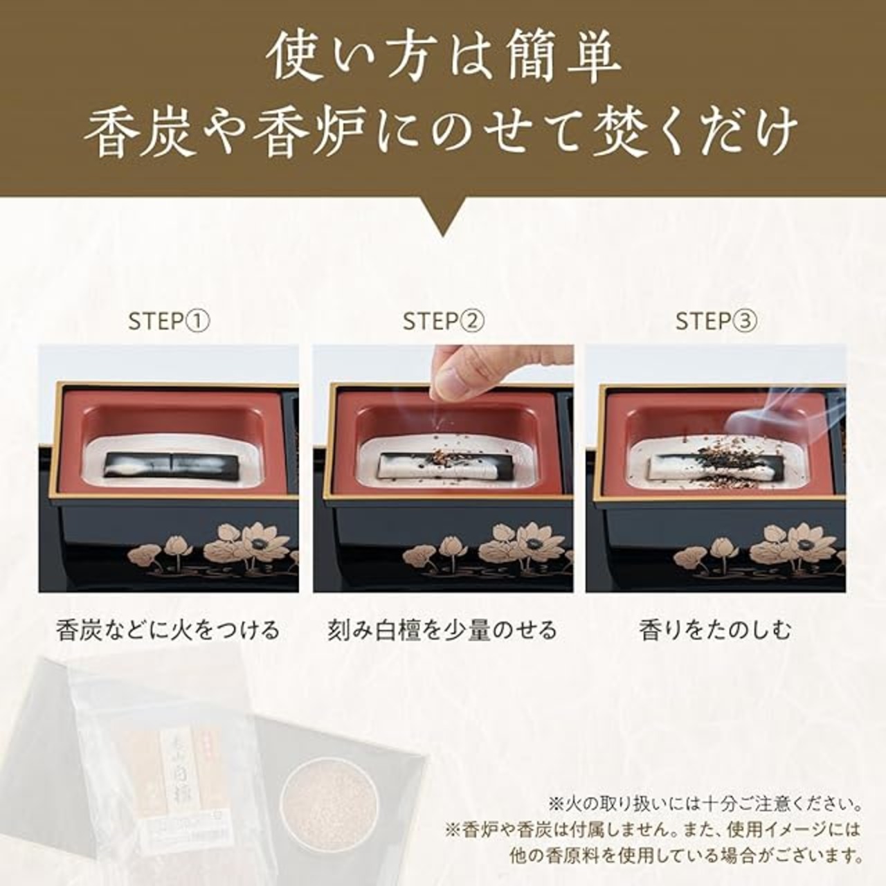 香炭などに火を付け、その上にこちらの商品をのせて焚いてください。