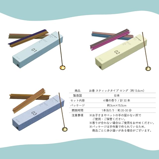 お香の種類と燃焼時間の目安 : お香の種類と燃焼時間の目安 / ・スティックタイプ(約7cm):約15~17分 / ・ロングスティックタイプ(約13.6cm):約20~30分 / ※燃焼状況によって異なる場合がございます。