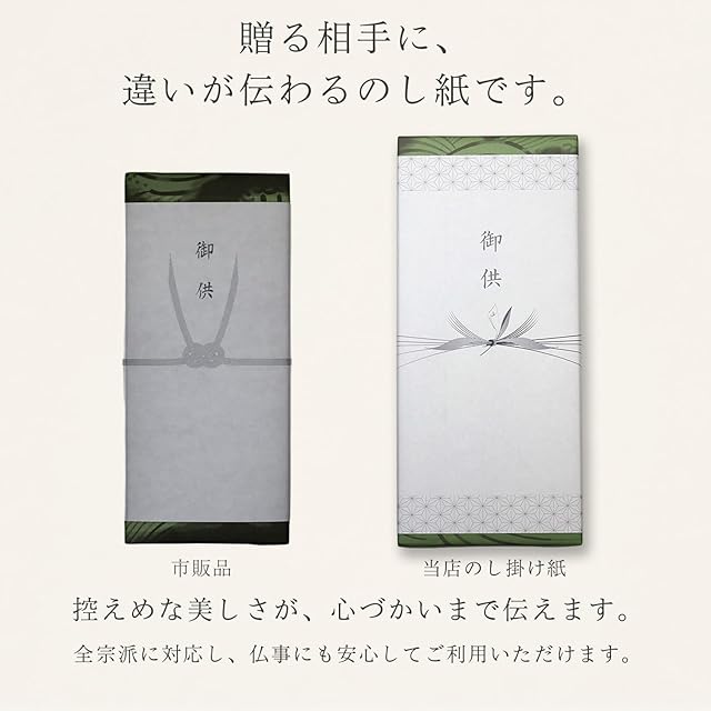 ■ 使用シーン ・全宗派および全仏事でお使いいただけます。 ・四十九日/一周忌/三回忌などの法要 ・葬儀/お盆/初盆/お彼岸のお供え ・年末のご挨拶や、喪中見舞いの贈り物にも最適
