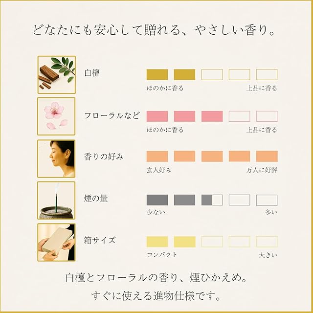 <p>大切な方へ、心を込めた贈答用お線香です。<br> 宗派を問わず、いつ贈っても失礼のない安心の贈り物。</p> <p>白檀と天然香料を調合したやさしく上品な香り。<br> 煙も控えめで、お部屋の空気を汚しません。</p> <p>内のし・包装で、四十九日や法要・喪中見舞い・初盆などすべてのお悔みごとに対応。</p> <p>金額を記載せず、ご遺族宅へ直接お届けいたします。<br> (ご注文時にカート画面でギフト設定をお選びください)</p>