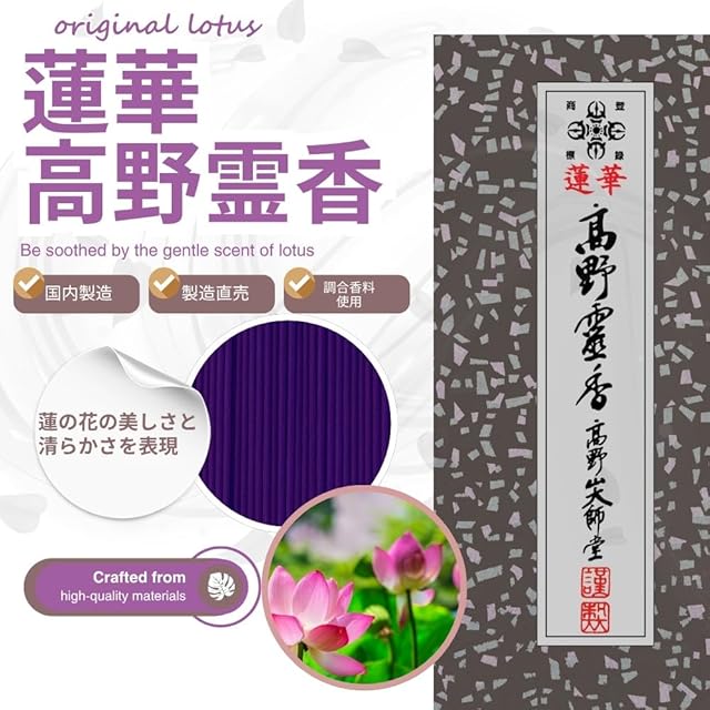 蓮華高野霊香は、古来より「蓮華(れんげ)」とも呼ばれる蓮の花をイメージし、仏様の功徳を象徴する清浄なお線香です。仏教を代表する花である蓮の美しさや清楚さを表現するするために紫の色彩と共に各種香原料を調合し、そのイメージを大切にしています。