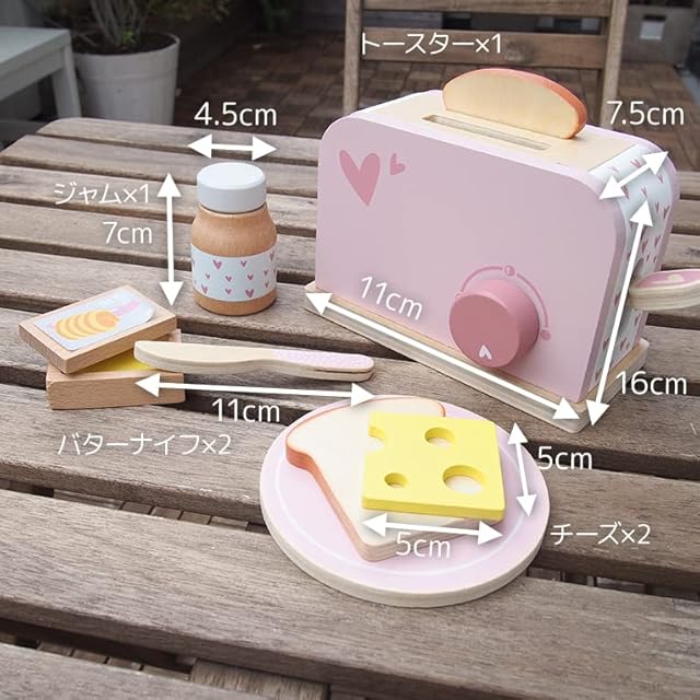 ヨーロッパのおもちゃの安全基準CEに合格。■サイズ:トースター×1 W16*L7.5*H11cm / プレート×2 直径10cm / パン×2 W7*L7cm / チーズ×2 W5*L5cm / バターナイフ×2 11cm / バター×1W6*L4*H2.5cm / ジャム×1 H7*直径4.5cm