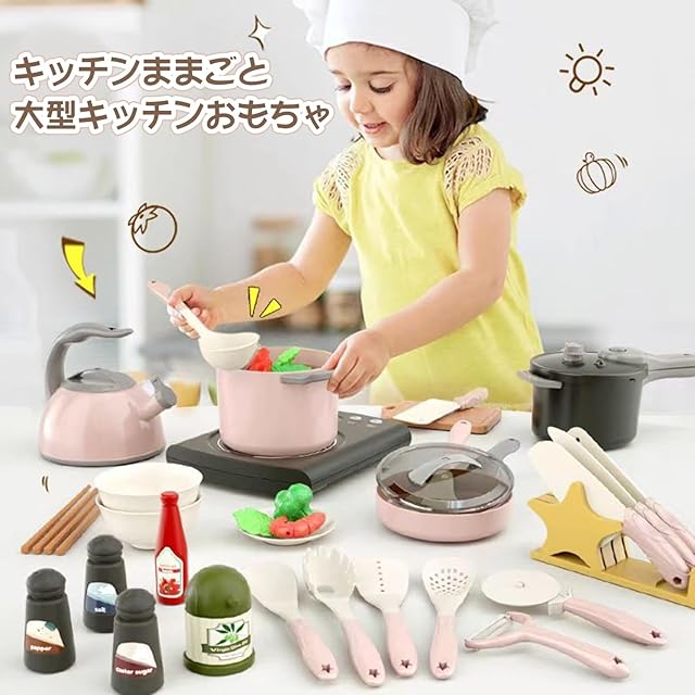 【リアルな感覚】圧力鍋に安全弁を付き、ケットルに本物の水を注すことができ、口にも蓋を付き、野菜、ジャガイモ、カボチャ、卵などの材料を入れて電磁調理器のスイッチを入れ、本格的に調理を始めます。まるで本物の料理人みたい、子供がおままごとに夢中!