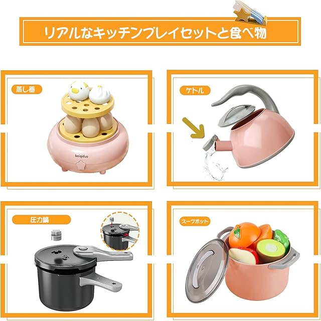 商品名:Funk Doggie おままごとセット おもちゃ 68点セット リアル噴霧 電磁調理器 2層蒸し器 圧力鍋 お鍋 ままごと用調理器具 贅沢食材 ごっこ遊び 親子遊び クリスマス 誕生日プレゼント 知育玩具