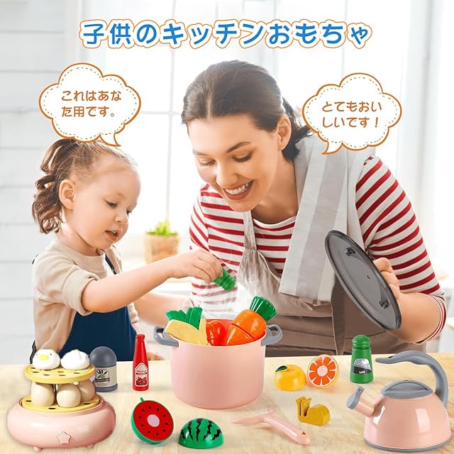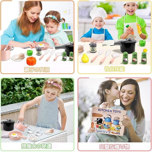 【知育玩具】このキッチンセットは、果物と野菜の種類が多いのですが、子供は遊びながら食材の名前もすぐに覚えられます。また、ごっこ遊びを通じて子供の右脳開発、手眼調和、認識能力、創造力などを向上させるだけでなく、集中力などを高めて、お子様の手先が器用になる能力を鍛えさせます。