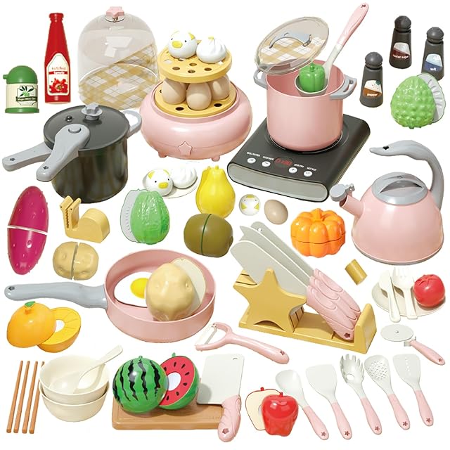 Funk Doggie おままごとセット おもちゃ 68点セット リアル噴霧 電磁調理器 2層蒸し器 圧力鍋 お鍋 ままごと用調理器具 贅沢食材 ごっこ遊び 親子遊び クリスマス 誕生日プレゼント 知育玩具