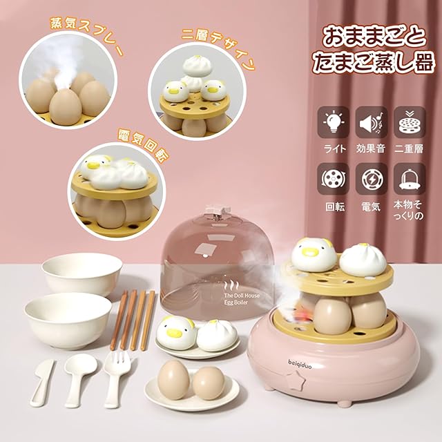 【多機能電動おもちゃ】この電動二階建て蒸し器は、1階に卵、2階に蒸しパンが入っており、LEDの照明効果と音と煙があり、本物の蒸し器のように回転するので、子供たちは本当に料理をしている気分になります。