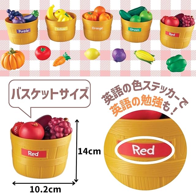 野菜や果物は5つのカラーに色分けされていて、バスケットにはそれぞれ英語で書かれた色ステッカーが付いています。バスケットに書かれている色ステッカーと同じ色の野菜や果物を入れて遊ぶことで、色を認識したり分類したりするスキルを身に付けることができます。色が英語で書かれているため、英語のお勉強にもなります。