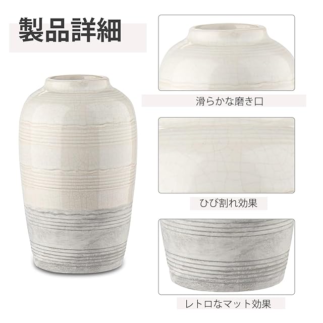 【洗練された表面仕上げ】こちらの陶器フラワーベースの表面には繊細な横ストライプ模様が施されており、花瓶全体にうっすらと入ったひび割れ加工が独特のヴィンテージ感を演出しています。優れた釉薬技術と高温焼成により、光沢感が美しいです。