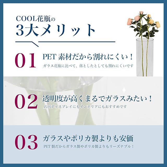 【割れない花瓶】PET製の割れない花瓶です。ガラスのような繊細で美しい見た目なのに落としても割れにくい理想のフラワーベースです。