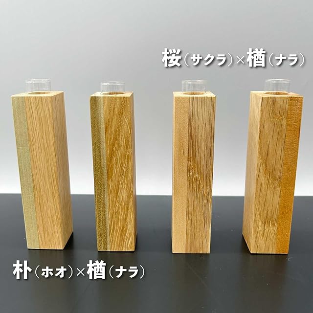 【木そのままの色を生かしたデザイン】土台部分は、飛騨産広葉樹の「朴(ホオ)」「桜(サクラ)」「楢(ナラ)」の3つの樹種のうち、2種類をつなぎ合わせた「朴×楢」「桜×楢」の2パターンからお選びいただけます。木そのままの色を生かし、ツートンカラーのようなデザインに仕上げました。シンプルながらも洗練されたデザインで、飾る場所を選びません。色味や木目の違いを楽しみたい方には、単品でのご購入よりもお得な2個セット(各1種)がおすすめです。