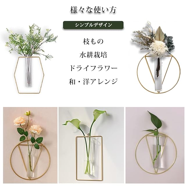 ガラス試験官の壁に掛けるタイプの花瓶。ゴールドフレームつきの高級感あるインテリア雑貨です。画像の植物とフックは付属しておらず、ガラス管花瓶とアイアンのみとなっております。ガラス試験官の壁に掛けるタイプの花瓶。ゴールドのフレームつき。一輪挿し エアプランツ クリスタル 人気の花瓶 おしゃれランキング 壁掛け ドライフラワー 花瓶 花瓶 ガラス エアプランツ 吊り下げ 花瓶 一輪挿し