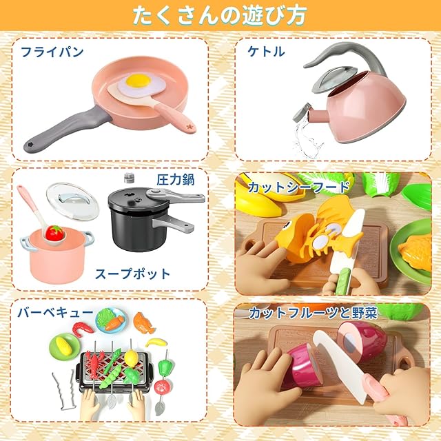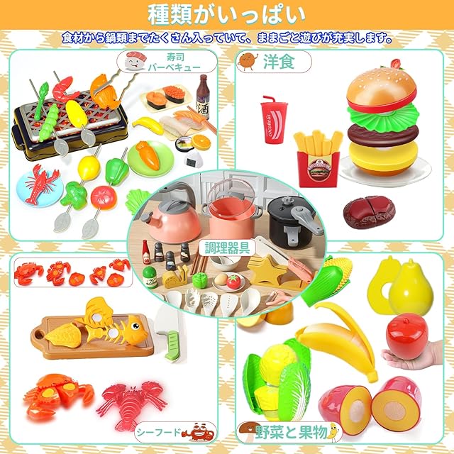 【超豪華、大量セット】寿司、野菜、果物、魚、エビ、カニ、沢山の調理器具、キッチン用具などいろいろあります。写真通りで色々な種類のおもちゃが入ってました!プラスチック製でとても軽くて。加えて、マジックテープ式、切る手応えの良い。収納用の折りたたみカゴ(片付けもしやすいです、遊びや整理がより簡単になる)。