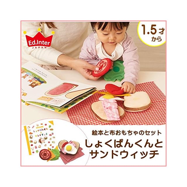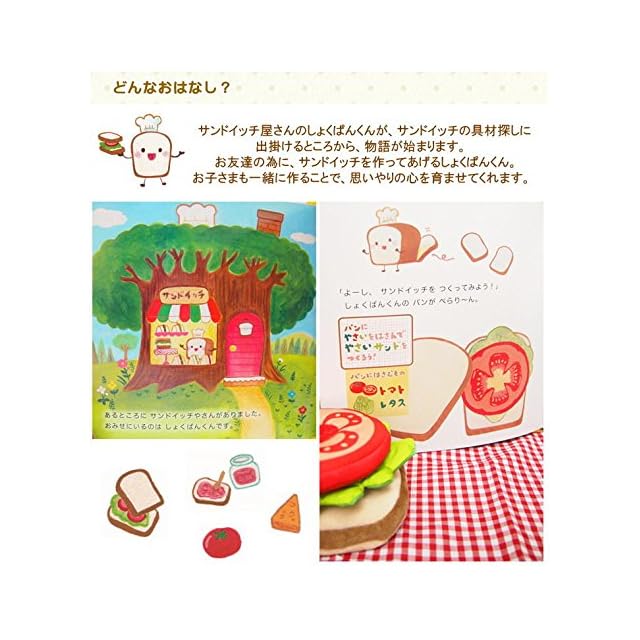 <br /> <br /> <br /> ▼対象年齢 <br /> 1.5歳~ <br /> <br /> ▼セット内容<br> <br /> 絵本×1 トマト・チーズ・レタス・タマゴ・ジャム・クロス×各1 <br /> ベーコン・パン×各2 <br /> <br /> ▼サイズ等(約cm) <br /> 絵本サイズ:w約18.5cm×d約1cm×h約18.5cm <br /> 食パンサイズ:w約12×d約1.2×h約10cm <br /> 総重量 約270g <br /> <br /> ▼主な素材 <br /> フェルト ※布おもちゃは手洗いOK! <br /> <br /> <br /> 絵本と布おもちゃがいっしょになった『えほんトイっしょ』シリーズ。絵本を読みながらお子さまと一緒にサンドウィッチが作れる体験型の知育絵本。 <br /> お子さまが楽しみながら野菜や料理に興味を持っていただけるような、食育にもぴったりの絵本です。 <br /> 絵本だけでもおもちゃだけでも遊べ、いっしょに遊ぶともっと楽しい!布おもちゃは手洗いできるので清潔に遊べます。 <br /> ベビーギフト として、男の子 女の子 どちらにでも喜ばれるので、出産祝いや、クリスマス お誕生日祝いなどギフトにおすすめです。 <br /> <br />