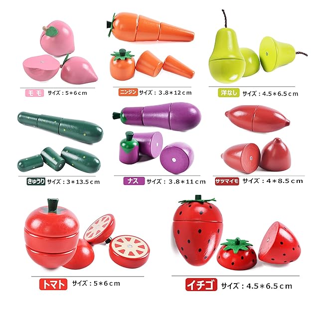木のあたたかみを感じることができる、木製のおままごとセット。木の包丁でフルーツやおやさいを切ってみよう!<br> ※天然の木製素材を使用している為、木目やキズ、塗装にムラが生じる場合がございます。<br><br> 子どもにとって、家庭は何より安心できる場所。<br> ごっこ遊びの中でも家庭を演じる「ままごと」を楽しんでいる時間は、 子どもにとって至福の時間なのです。<br> 「ごっこ遊び」は遊びながら観察力や想像力、記憶力が高まり、知識や語彙が増えることで言語能力の発達に役立ちます。二人以上でごっこ遊びを楽しむことで分かち合うこと、協力すること、相談することを学ぶことができ、学校や社会に溶け込む基礎をつくることにもつながります。<br><br> <セット内容>イチゴ、モモ、洋なし、ニンジン、きゅうり、ナス、トマト、サツマイモ、包丁、ピーラー、まな板、収納木箱×各1<br> <主な材質>木<br> <トレイサイズ>22cm×15cm×10cm<br> <安全基準>CE(ヨーロッパの安全基準)に認定されたお子様にも安心安全な塗料・染料を使用しています。