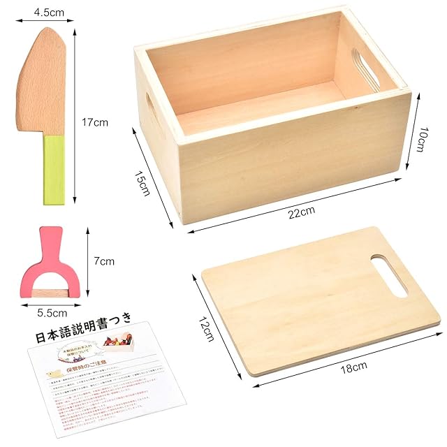付属の包丁でサクッと切れて木の重さが心地いい。おままごと遊び定番の野菜や果物、包丁やまな板、お片づけに便利な木箱も一緒に入った大変お得なセットです。