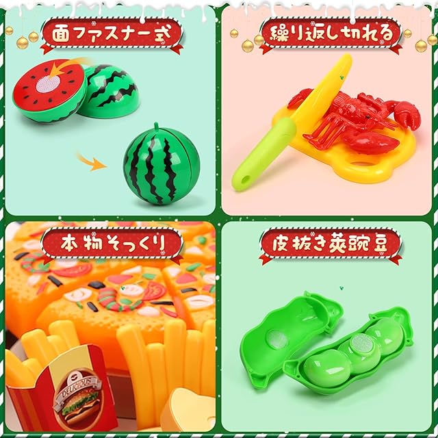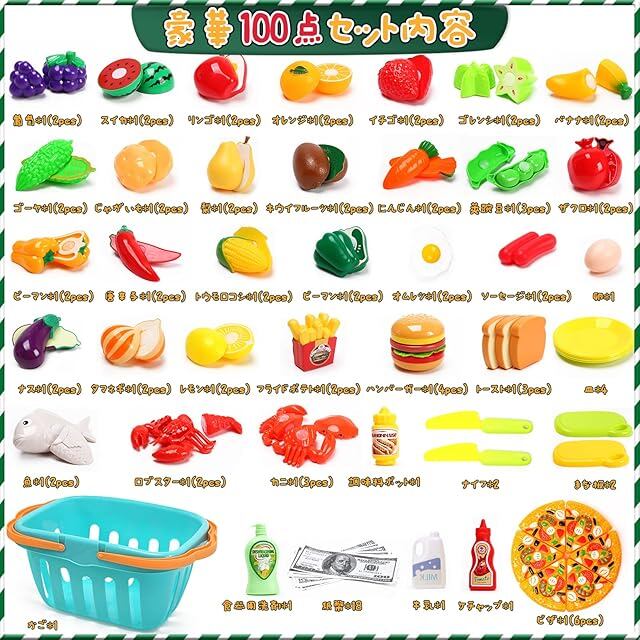【豪華100点セット内容】食材種類が豊富で、楽しく遊びながら食育を!本物の食物のように、果物(葡萄、スイカ、リンゴ、オレンジ、イチゴ、ゴレンシ、バナナ、、梨、キウイフルーツ、レモン、ザクロ)、野菜(ゴーヤ、じゃがいも、トウモロコシ、にんじん、莢豌豆、黄唐辛子、赤唐辛子、ピーマン、ナス、タマネギ)、揚げた料理(フライドポテト、オムレツ)、調理器具(ナイフ、まな板、皿)、海鮮(ロブスター、魚、カニ)、食パン(トースト、ハンバーガー、ピザ)、飲み物(牛乳)、そのほか(ソーセージ、卵、紙幣、食器用洗剤、調味料ポットケ、チャップ、かご)などいろいろあります。日常生活やダイニングシーンを再現し!お子様に料理の楽しみを体験させて、お母さんは子供が台所に入ることを心配無し! 【収納かご付き】収納かご付きなので、後片付けの習慣を身に付けます。また、持ち運びも楽なので、場所を変えて遊びやすいです。 【安全な素材】優れたABS素材を採用しており、万が一口に触れても安全な成分となっています。鋭い部分も丸く処理していて、お子様の安全のために丁寧に作られたのです。※子供が遊ぶの際には誤飲にお気を付けてください。 【知育に良さそう】子どもはおままごと遊びを通して生活の中の野菜、果物などを知り、色を見分けます。大人の言葉のまねをして、子供の右脳開発、手眼調和、認識能力、創造力などを向上させるだけでなく、集中力、思考力なども高めます。また、大人も子供と一緒にごっこ遊びしたり、食材を切ったり、いい親子思い出を作ります。 【クリスマスプレゼントに最適!】お子様へのクリスマスプレゼントとして最適!お誕生日、入園お祝い、進学のお祝いなどのプレゼントにもお勧めです。