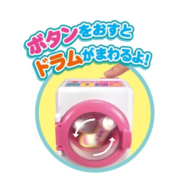 洗濯機にカゴ、アイロンとアイロン台、せんたくものを干すこともでき、かわいい洗濯バサミ等も入ったおせんたくセットです。ボタンでドラムがまわります。