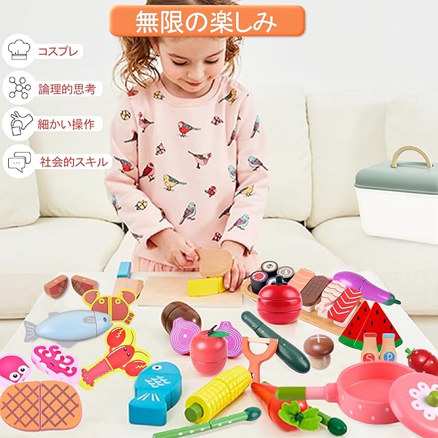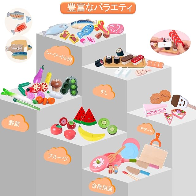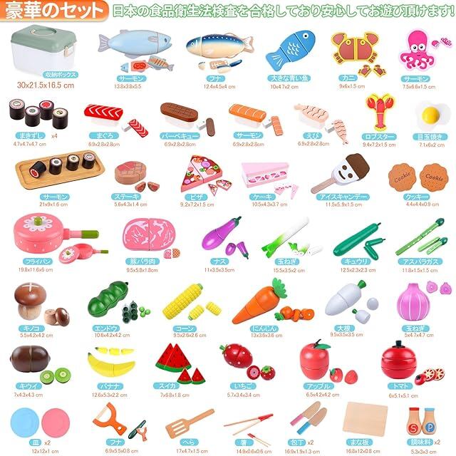 【超豪華、大量セット】計49点:このセットには寿司、野菜、果物、ピザ、魚、エビ、カニ、ステーキ、ビーンズ、アスパラガスが、ケーキ 、キッチン用食器などいろいろあります。木の温かみと適度な重みが高級感!また、セット内のバリエーションも多く、磁石で疑似的な調理が楽しめるので。なかなか他では売ってない内容がつまってます。包丁、まな板、フライ返し、塩、胡椒、ピーラー、お皿と必要な物は揃っているので買い足さずに遊べます!1個プラスチック収納箱(高品質、片付けもしやすいです、遊びや整理がより簡単になる)。日本の食品衛生法検査を合格しており安心してお遊び頂けます。