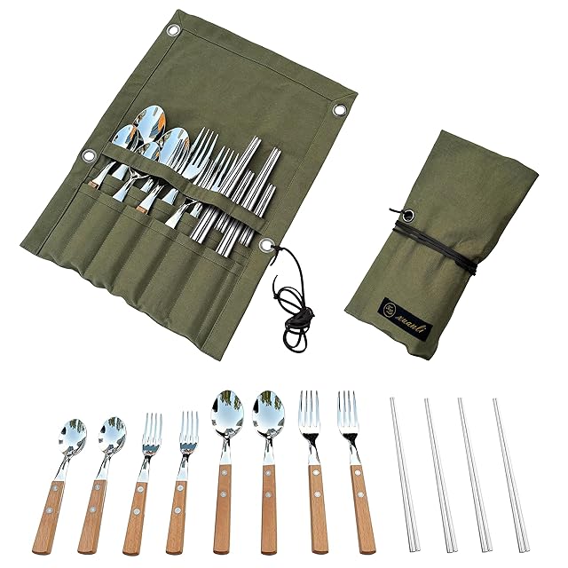 【専用カトラリーケース】帆布コットンと牛革使用、高品質アウトドアカトラリーセット このアウトドアカトラリーセットは、専用のカトラリーケースが付属しています。カトラリーケースは、本体には帆布コットン、紐には牛革を使用し、高品質な作りになっています。カトラリーケースのサイズは縦34.5cm×横26.5cmと適度な大きさで、カトラリーをジャストフィットさせることができます。帆布コットンの本体は丈夫で耐久性があり、牛革の紐は上品な風合いを添えています。この専用カトラリーケースは、熟練した職人の手によって作られています。品質には細部にわたるまでこだわりがあり、耐久性と使いやすさを兼ね備えています。持ち運びの際には、カトラリーケースがカトラリーをしっかりと保護し、整理整頓された状態で持ち運ぶことができます。また、デザインの美しさと高品質な素材の組み合わせにより、アウトドアシーンでの使用だけでなく、キッチンやダイニングルームでの収納にも適しています。