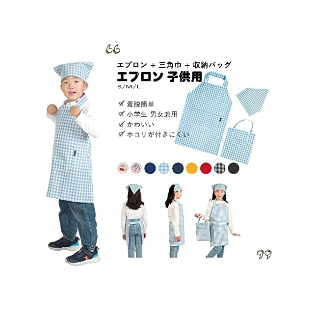 「可愛いデザインキッズエプロン」:お子様のために特別にデザインされたキュートなエプロン。鮮やかな明るい8色のカラーバリエーションで、お子様にぴったりです。 子供たちの自然な遊び心(例えば、シェフに扮するとか)に対応した独自のプリントで、家族で楽しむときも、一人で着るときも、楽しい気分にさせてくれます。 エプロンと三角巾と専用の収納袋は セットになっており、すべて丸角の柔らかいマジックテープが付いているので、子どもが一人でも着脱が安全で簡単です。お子さんを一人で活動させましょう