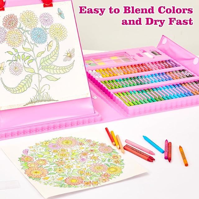 KINSPORY 290点 お絵描きセット 子供用 アートセット、両面イーゼル 水彩画 色鉛筆 絵の具 マーカー クレヨン セット、新進アーティスト向けの 学用品 画材 ケースギフトガールズボーイズキッズティーンズ 子供2人遊び用 (ピンク)