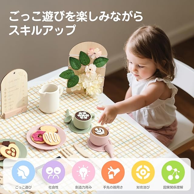 カフェのように楽しめる、かわいいおままごとセットです。オリジナルのデコレーションボードで、お子様の創造性がぐんぐん広がります。軽くて安全なシリコンと木の素材なので、小さなお子様も安心。お片付けも付属の収納カゴでぱっと簡単。おもてなしの心やメニューを考える創造力、指先の器用さから「できた!」という自信まで、楽しく遊びながら自然に培うことができます。
