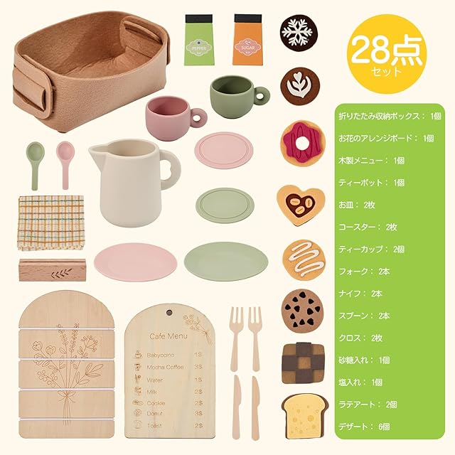 Mamimami Home おままごと ティーセット おもちゃ カフェ お茶会セット 子供 ままごと 遊び デザート 玩具 28点セット 誕生日プレゼント 女の子 3歳 コンパクト 収納付き