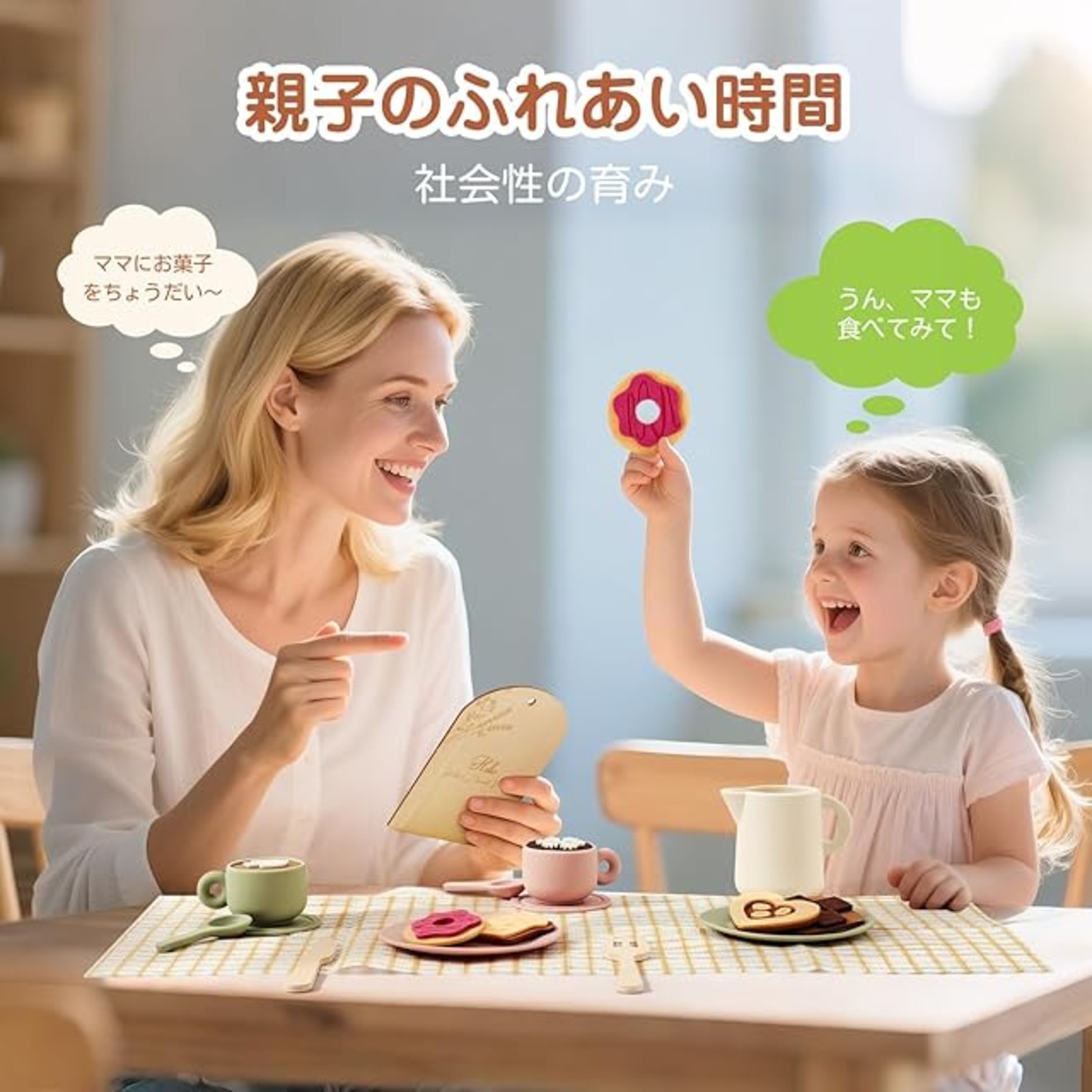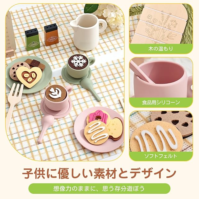 【とにかく本格的】食品級シリコーン製の食器に加え、フェルトで作られた「コーヒーアート」と「焼き立てクッキー」も付属しており、本格的なカフェ気分を楽しめます。ティーポットでお湯を「ジュージュー」と注ぎ、クッキーで「いらっしゃいませ!」と楽しくごっこ遊びができます。