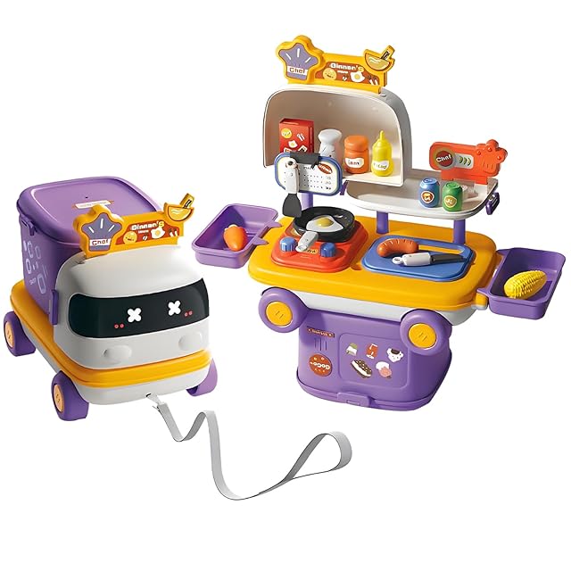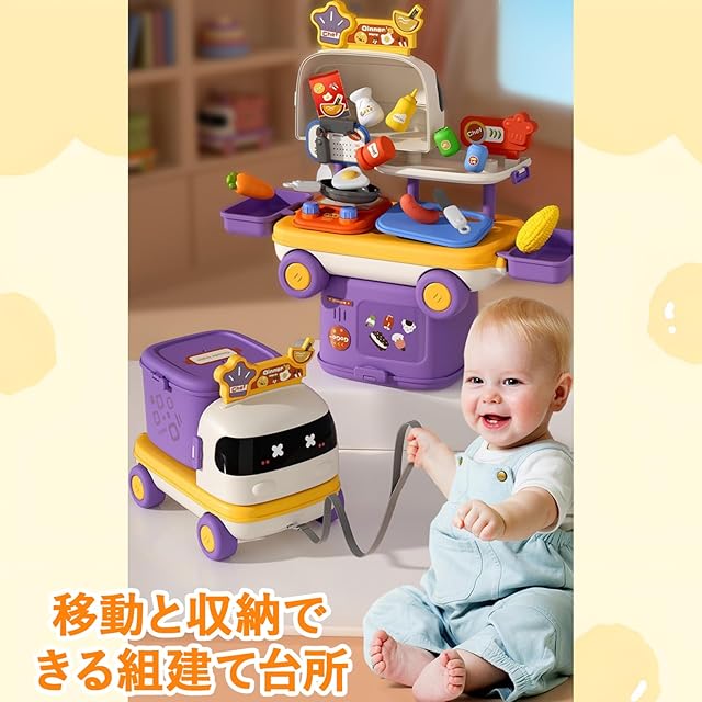 【どこでもキッチンセット】車に移動できる台所本体、野菜、果物、調味料、キッチン用具、調理器具などバリエーション豊なキッチントイおもちゃで、お子様一人でも 、お友達や家族と一緒に楽しく遊びます。