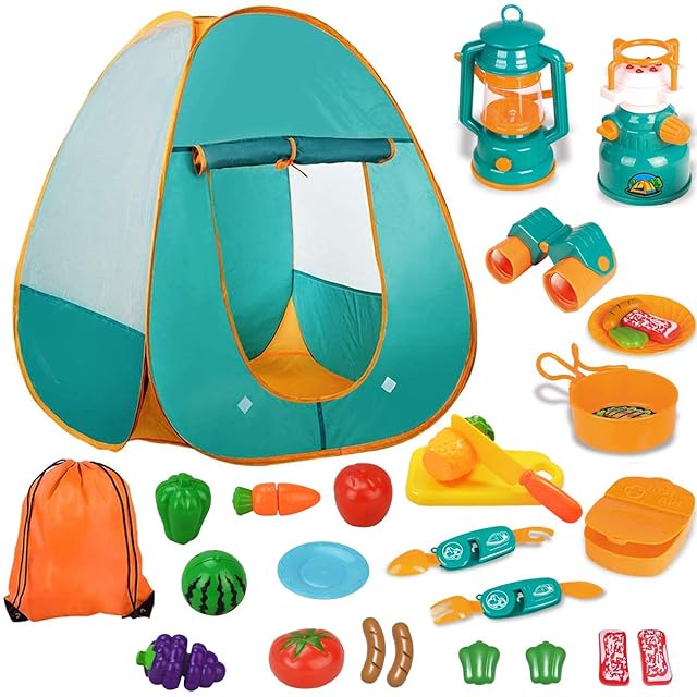 ⁂「豪華なキャンプセット」小さな探検家にとって必需品:折りたたみ式ワンタッチテント、電池式ランタン、コンロ、双眼鏡、調理パン、お皿、多機能ナイフ・フォーク、野菜や果物がたくさん含めている豪華な25点セットです。かわいいディザインの子供テントトは室内外を問わず、おもちゃ、おままごと、テントハウス、秘密基地や知育玩具などとして遊びに最適です!お子様の想像力や創造力も豊かにしてくれます。