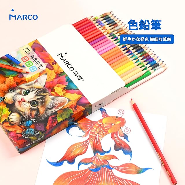 【多彩な色】Marcoの油性色鉛筆 72色セット、紙箱入りで持ち運びにも便利。