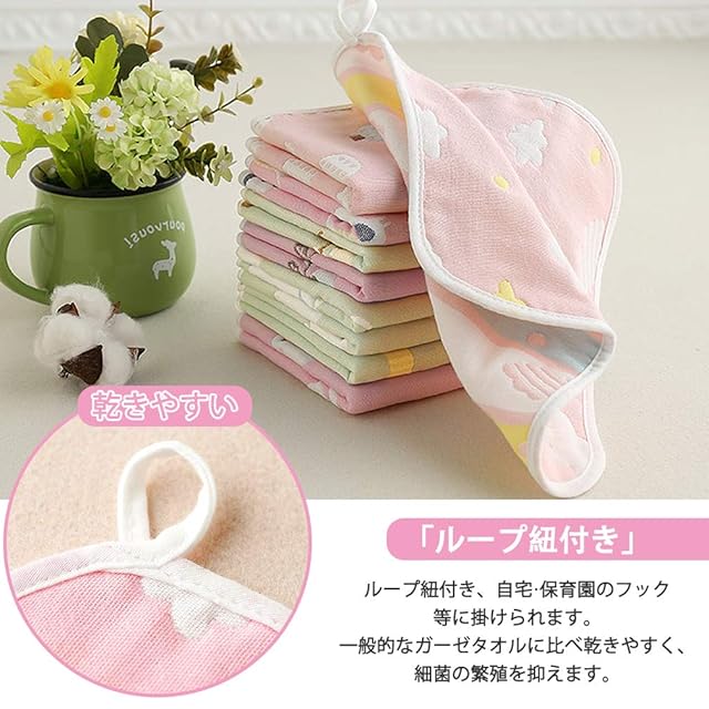 「ループ紐付き」ループ紐付き、自宅·保育園のフック等に掛けられます。一般的なガーゼタオルに比べ乾きやすく、細菌の繁殖を抑えます。洗濯を繰り返しても吸水力が落ちないので、長持ちできます。