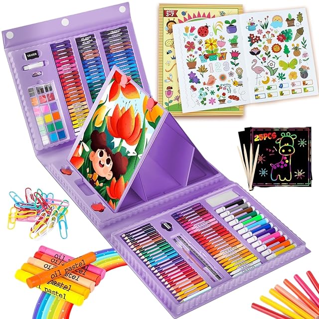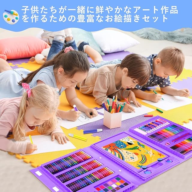 【超豪華お絵描きセット】セット内容:A4塗り絵本×1冊 「可愛なシール付き」、40枚10色折り紙、子ども安全はさみ×1、オイルパステル×48、クレヨン×24、色鉛筆×24、固形水彩×18、水性マーカー(細)×24、水性マーカー(太)×12、画用紙×10などです。お子様への入学祝い、誕生日プレゼント、クリスマスプレゼントをお探しの方に、このお絵かきセットは、お子様に確実に「ワウ!」の瞬間を提供します。