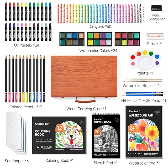 Shuttle Art 106ピース デラックスアートセット アート用品 木製ケース入り クレヨン付き 色鉛筆 オイルパステル 水彩ケーキ 塗り絵 スケッチパッド 子供 大人用