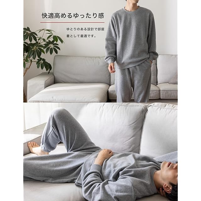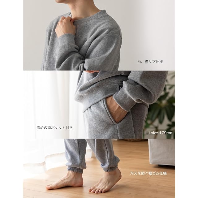 【保温性の高い裏起毛】薄すぎず、厚すぎ無い生地はごわつかず軽量でソフトな肌触り。裏起毛素材が空気を溜めて保温してくれるので防寒性もあるパジャマになります。ナチュラルな杢調カラーで毛玉が目立ちにくく、部屋着はもちろんコンビニなどのちょっとした外出にも最適!部屋干しでも乾きやすい素材を採用しているので毎日着用できます。
