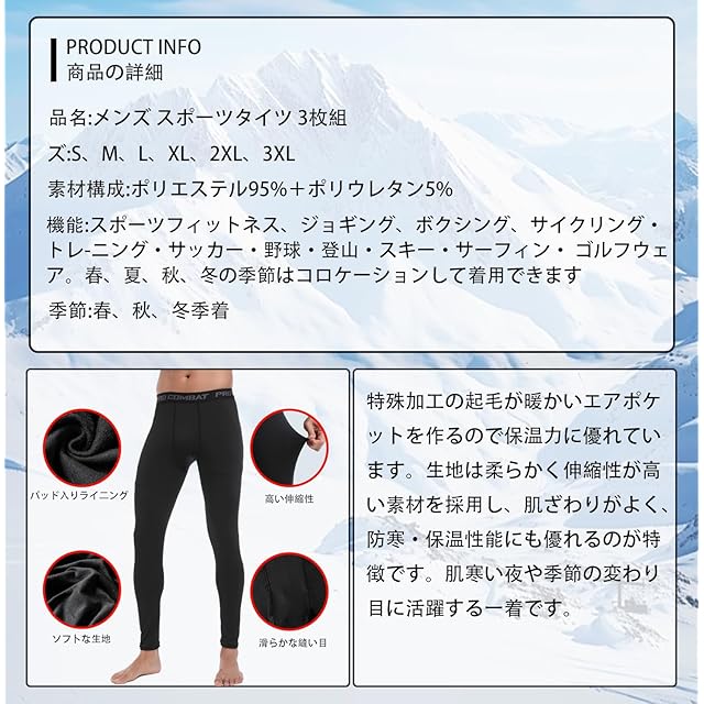 商品名:[LZLLZQ] 3枚セット 裏起毛 冬用 インナー ロングタイツ メンズ スポーツ スパッツ [防寒・軽量保温・伸縮性・吸汗速乾] コンプレッション タイツ スポーツウェア ランニングウェア ロング あったかインナー