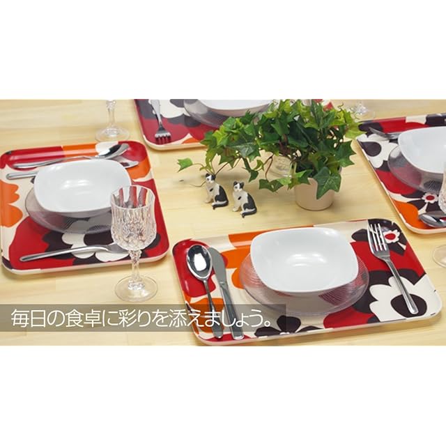 おしゃれ心いっぱいのテキスタイルと、耐水性に優れ、食品衛生法にも合致したリードフリーの安全な樹脂と塗料で作ったテキスタイルトレイ。 ●持ち手部分を省く事により、トレーの隅々まで使えるようにデザインされたスクエアタイプのトレー。トレーとしてだけでは無く、お料理と一緒にレンジで暖めた後はテーブルまで運んでランチョンマットとしてもご利用頂けます。 ●同じ柄の別サイズのトレーもございます。お揃いで揃えればお食事の時間がもっと楽しくなります。 ●テキスタイル(布地)ならでの風合いをそのままに、機能性を追求したトレーです。 ●「日本三大漆器」に数えられる、お盆の産地「紀州漆器(和歌山県海南市)」の技術で作られた、日本製の製品です。
