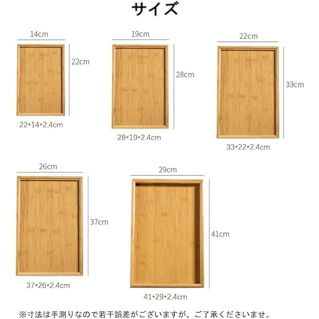 この竹製トレイは、天然素材を活かした和風デザインで、長41cm×幅29cm×高さ2.4cmのサイズで、重量約480g。ブラウンの無地で、優れた抗菌・防臭効果があり、撥水性も高いため、清潔に保つことができます。なめらかに加工された表面は、見た目も美しく、使い心地も良好です。お手入れは、から拭きして乾燥させるだけで簡単です。キッチン用品や小物の収納に使うこともできますが、重い食器やランチセットなどは置かないでください。