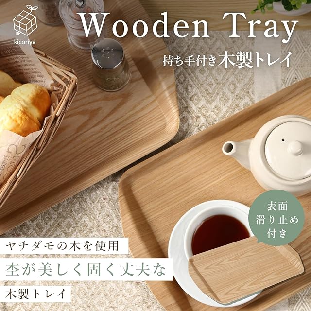 木製トレイ トレー 持ち手付き カフェ 長方形 お盆 すべり止め加工 ノンスリップ kicoriya (小)