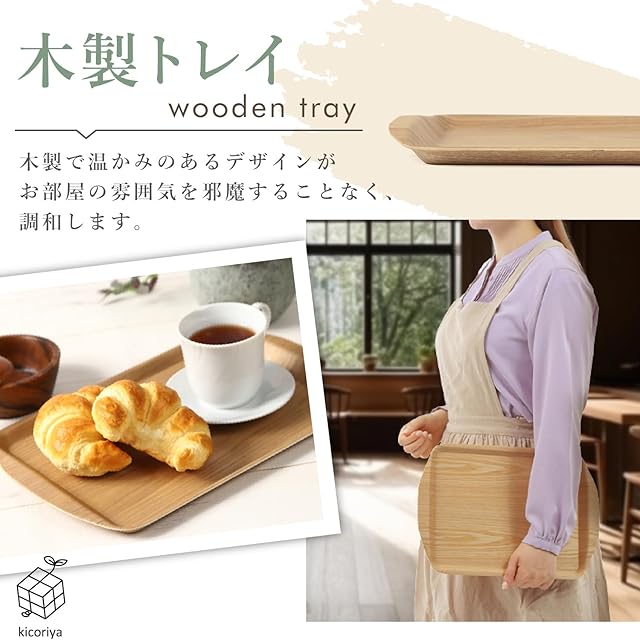 商品名:木製トレイ トレー 持ち手付き カフェ 長方形 お盆 すべり止め加工 ノンスリップ kicoriya (小)