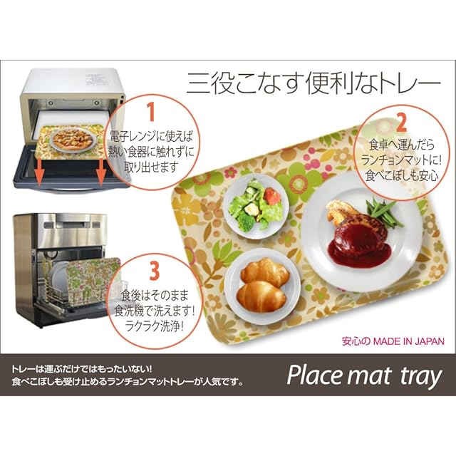 おしゃれ心いっぱいのテキスタイルと、耐水性に優れ、食品衛生法にも合致した安全な樹脂とで成形したテキスタイルトレイ。 ●持ち手部分を省く事により、トレーの隅々まで使えるようにデザインされたスクエアトレー。トレーとしてだけでは無く、ランチョンマットとしてもご利用頂けます。