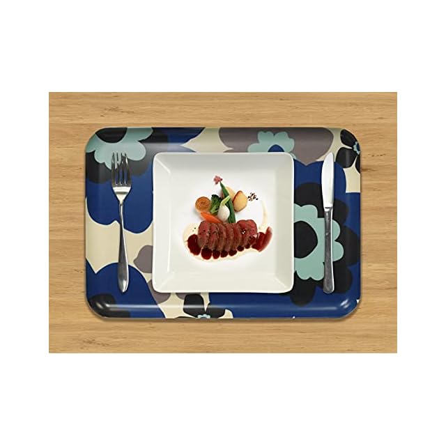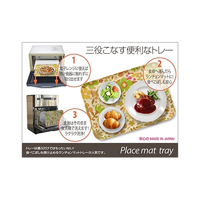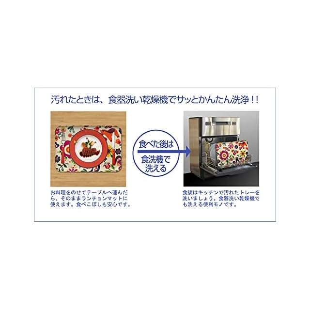 おしゃれ心いっぱいのテキスタイルと、耐水性に優れ、食品衛生法にも合致した安全な樹脂と塗料で作ったテキスタイルトレイ。 ●持ち手部分を省く事により、トレーの隅々まで使えるようにデザインされたスクエアタイプのトレー。トレーとしてだけでは無く、お料理と一緒にレンジで暖めた後はテーブルまで運んでランチョンマットとしてもご利用頂けます。 ●同じ柄の別サイズのトレーもございます。お揃いで揃えればお食事の時間がもっと楽しくなります。 ●テキスタイル(布地)ならでの風合いをそのままに、機能性を追求したトレーです。 ●「日本三大漆器」に数えられる、お盆の産地「紀州漆器(和歌山県海南市)」の技術で作られた、日本製の製品です。