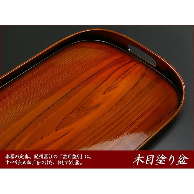 漆器の定番、紀州黒江の「杢目塗り」に、すべり止め加工をつけた、おもてなし盆。お客様へのお茶出しなどにピッタリです。 ・「日本三大漆器」に数えられる、「紀州漆器」の伝統ある技術で育まれた逸品は、使い込む程に愛着が湧いてきます。・漆器という伝統工芸を、今という時代に融合させた暮らしに寄り添う漆器です。